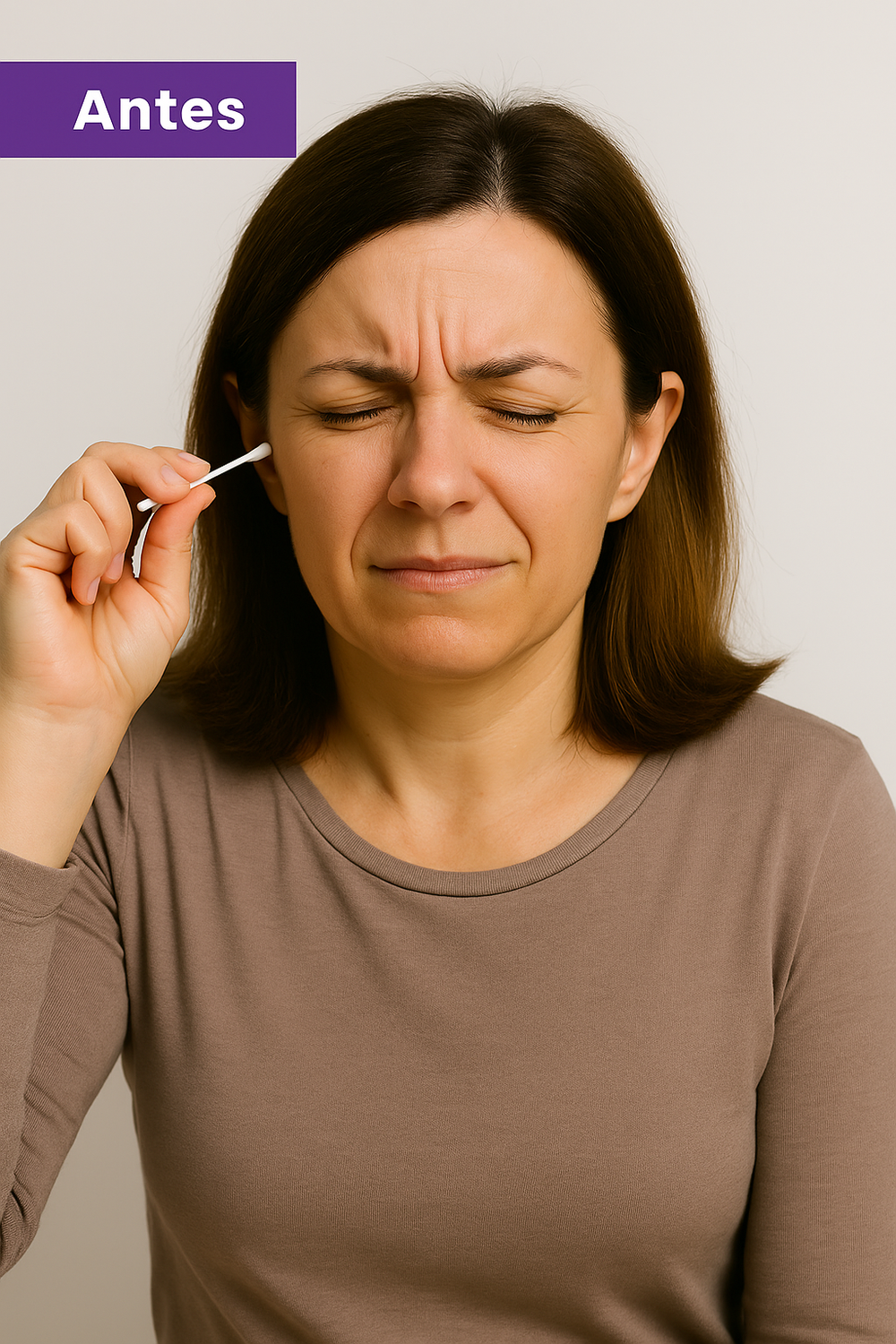 Antes: Usas hisopos y empujas la cera más adentro. Sientes picazón o molestia, pero no sabes qué pasa dentro del oído